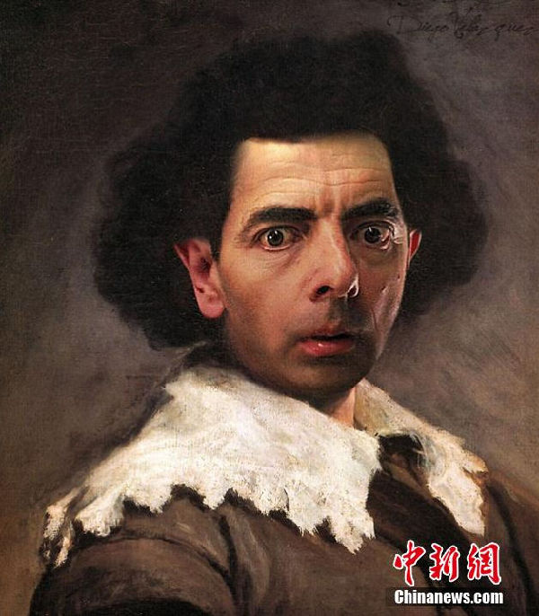 A fancy lace collar wraps around Mr Bean's neck in this parody of a classic portrait. [Photo/Chinanews.com]