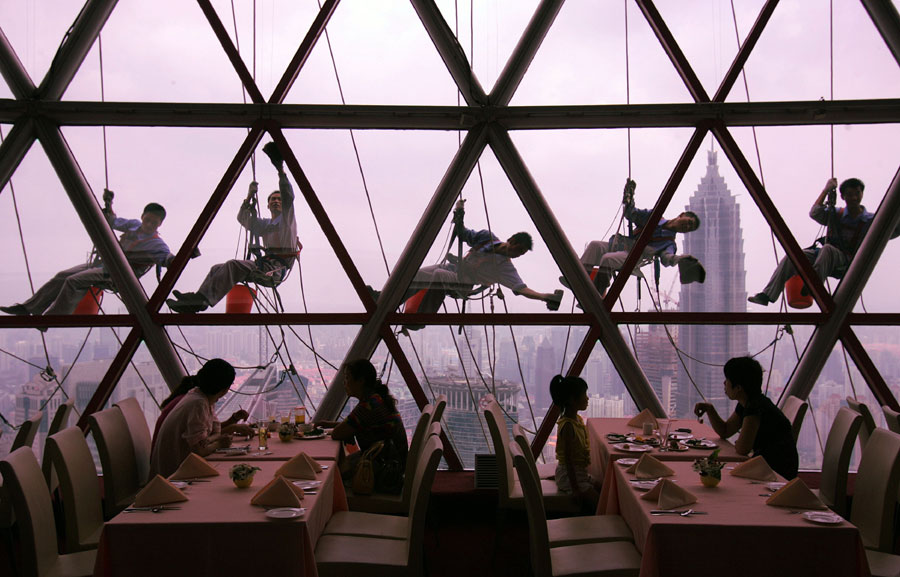 Spidermen cleaning the Oriental Pearl, by Wang Jie. [Photo provided to chinadaily.com.cn]
