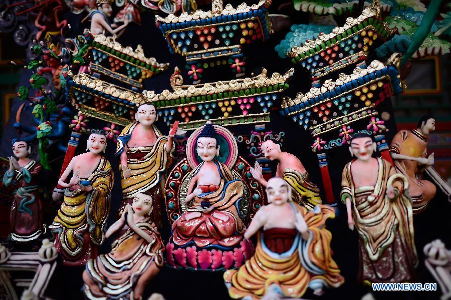 Ghee flower figurines are seen at Taer Monastery in Xining, Northwest China's Qinghai province, March 5, 2015. Ghee flower exhibitions are held in Taer Monastery in Qinghai province and Labrang Monastery in Gansu province, both prestigious Tibetan Buddhist monasteries, to celebrate the Lantern Festival on March 5. [Photo/Xinhua]