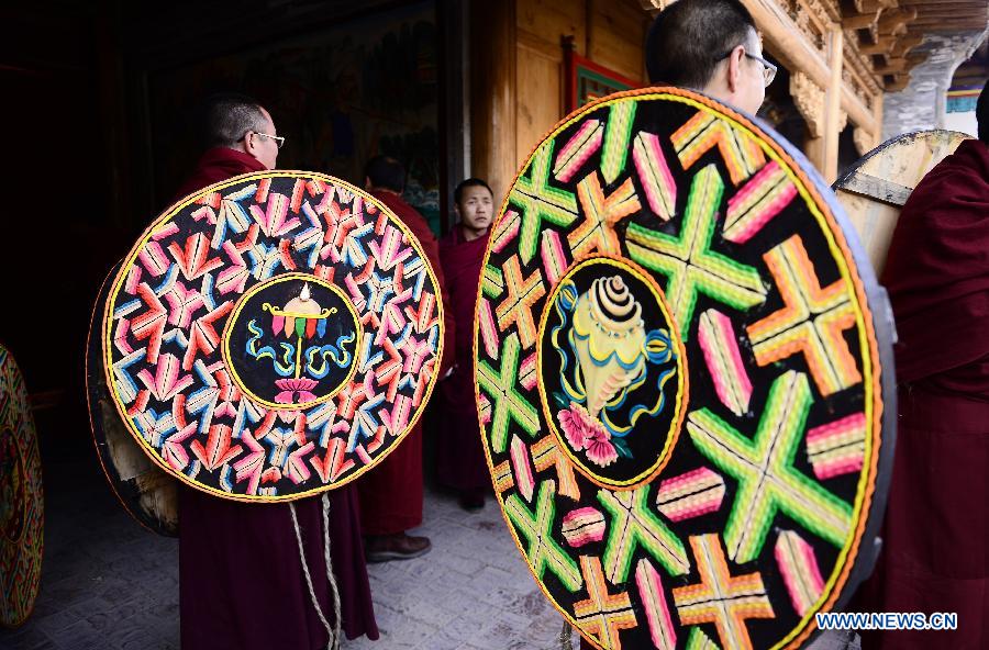 Monks carry ghee flower artworks at Taer Monastery in Xining, Northwest China's Qinghai province, March 5, 2015. Ghee flower exhibitions are held in Taer Monastery in Qinghai province and Labrang Monastery in Gansu province, both prestigious Tibetan Buddhist monasteries, to celebrate the Lantern Festival on March 5. [Photo/Xinhua]