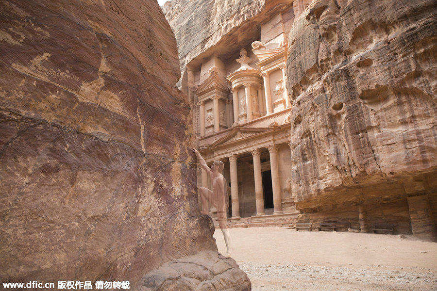 Trina Merry blends a man into the Petra in Jordan with her incredible body art. [Photo/IC]