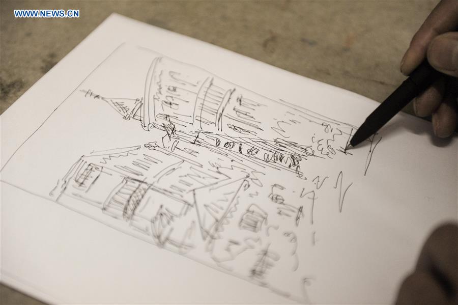 Artist Zhu Xiaodong draws a draft at his workshop in Harbin, capital of Northeast China's Heilongjiang province, Jan 29, 2016. [Photo/Xinhua]