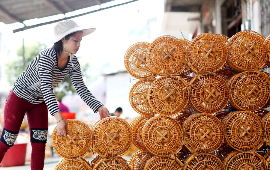 A woman moves finished birdcages at a family workshop in Baipeng town of Liujiang county, Southwest China's Guangxi Zhuang autonomous region, March 8, 2016. [Photo/Xinhua]