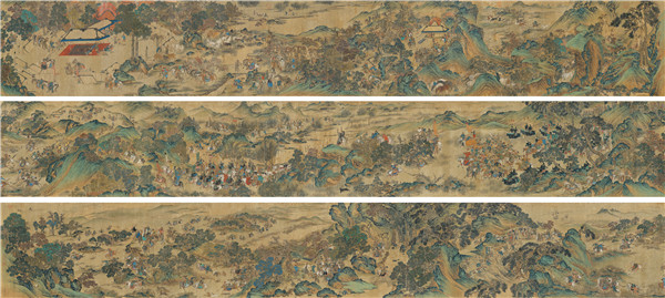 Autumn Hunting of Yuan People, believed to be a joint effort of anonymous painters, depicts a panoramic view of royals and troops of the Yuan Dynasty (1271-1368). [Photo provided to China Daily] |