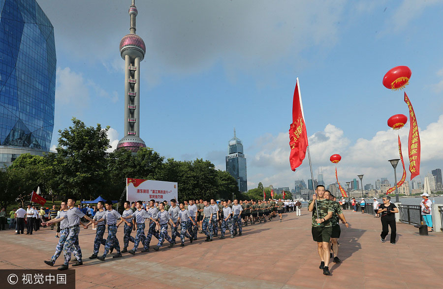 A relay race gathering retired military cadres, soldiers in active service, students from universities, secondary and primary schools kick off in Pudong district of Shanghai. Soldiers from all armed forces in Pudong join the event. [Photo/VCG]