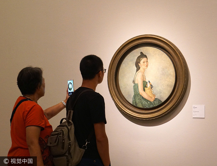 People look at a painting on display at the National Art Museum of China in Beijing, on Aug 15, 2017. More than 40 art pieces including sculptures and paintings are on show at the museum until Aug 31, demonstrating the achievements of young Chinese artists and the development of contemporary Chinese art. The artworks are selected from collections of the museum. [Photo/VCG] |