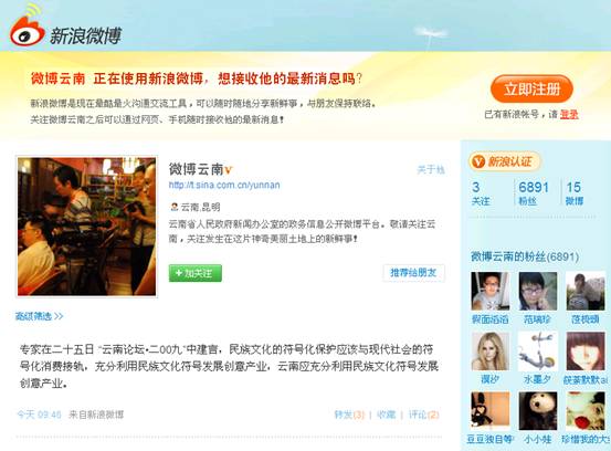 微博,并不是新鲜事物。用户利用手机短信或彩信,发送一句话、一条消息到自己的博客上,随时随地与朋友分享着新鲜事。可是作为政府新闻办公室信息公开和新闻发布的微博平台,“微博云南”无疑是全国省级政府第一个应用微博开展新闻发布的。点开“微博云南”,首先进入眼帘的是这样几句话“云南省人民政府新闻办公室的政务信息公开微博平台。敬请关注云南,关注发生在这片神奇美丽土地上的新鲜事!”
