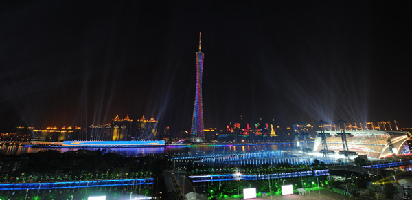 随着第16届亚运会的临近,装扮一新的广州灯光璀璨,夜空流光溢彩,迷人的羊城静候四海宾朋的到来。图为海心沙岛与隔岸的城市建筑群构成了一副“霞光、水影、灯景”相互交融的城市风情画(11月9日摄)。新华社记者 王颂 摄