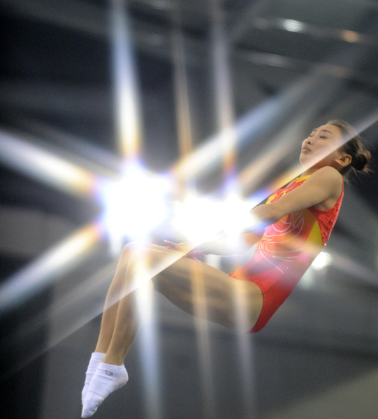 11月22日,中国选手何雯娜在比赛中。当日,在广州进行的第16届亚运会蹦床女子个人决赛中,中国选手何雯娜以40.90分获得银牌。 新华社记者 王雷 摄