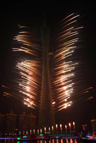 11月27日,焰火在广州塔上绽放。当日,第16届亚运会闭幕式在广州举行。 新华社记者 杨俊江 摄