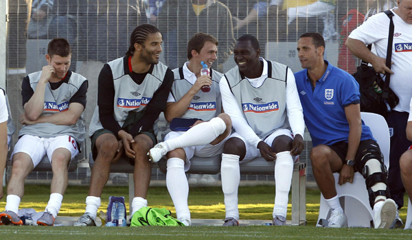 英格兰队里奥·费迪南德(右)与队友观看比赛。图片来源:路透