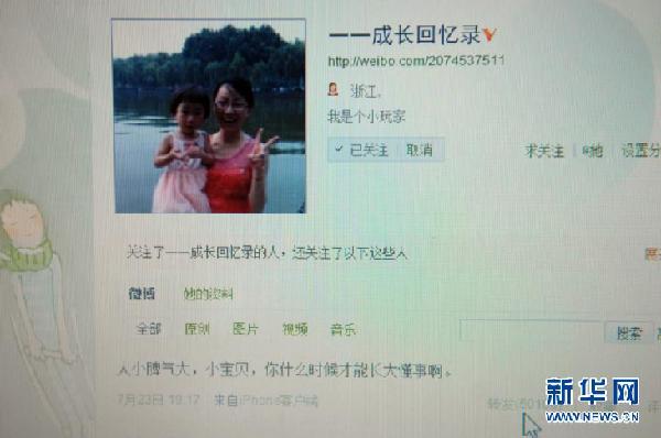 资料图片:这是7月23日19时23分,项炜伊的母亲施李虹生前所发的最后一条微博(7月28日摄)。 “人小脾气大,小宝贝,你什么时候才能长大懂事啊新华社记者 黄宗治 摄