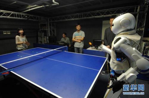 当日,由浙江大学智能系统与控制研究所机器人实验室研制的两个仿人机器人“悟”和“空”正式亮相,这两个会打乒乓球的机器人可以通过头上安装的摄像头捕捉乒乓球在空中的运动轨迹,预测球的落点,然后做出相应的反应动作,甚至可以实现与人对打。,集成了机器人领域的诸多先进技术:身躯采用了高强度轻质材料和加工工艺,全身有30个关节,仅手臂就能做7个自由度的运动。据了解,浙江大学下一步将研发更加灵活和快速的机器人,并将与智能认知技术相结合,构成仿人型的智能家用服务机器人。新华社记者鞠焕宗 摄