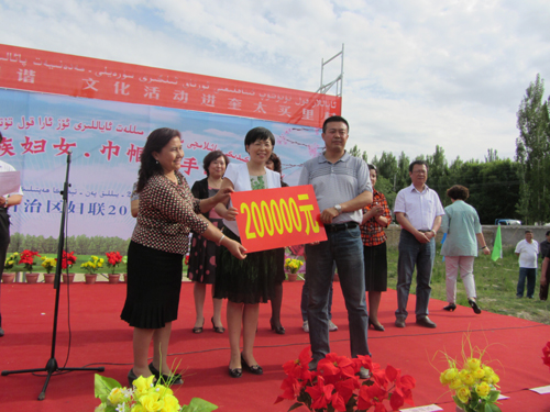 在伊宁县阿热吾斯塘乡奎太买里村举行的活动启动仪式上,自治区妇联党组成员、副主席孙华现场为伊宁县妇联、伊宁县农村信用合作社发放20万元妇女小额担保贷款创业项目担保金,用于支持奎太买里村开展妇女创业活动,并在该村启动妇女创业就业SYB培训项目。同时协调伊宁县农村信用合作社,现场为5名奎太买里村有获贷愿望的妇女发放15万元的贷款。为伊宁县阿热吾斯塘乡奎太买里村妇代会发放用于开展“妇女之家”建设和妇女活动经费5万元,捐赠书籍、宣传资料5000余册,邀请州歌舞团为村民表演文艺节目,送文化下乡丰富村民的文化业余生活。现场观看节目的各族妇女们,迫不及待地将自治区妇联赠送的纱巾围上,高兴地互相评比着。