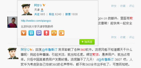 方舟子连续发布微博,直指360窃取用户隐私、绑架欺骗用户的安全隐患。比如上传用户微博等的账号密码,导致登陆时进入他人账号的串号;伪装成微软补丁实际安装360浏览器等等问题。