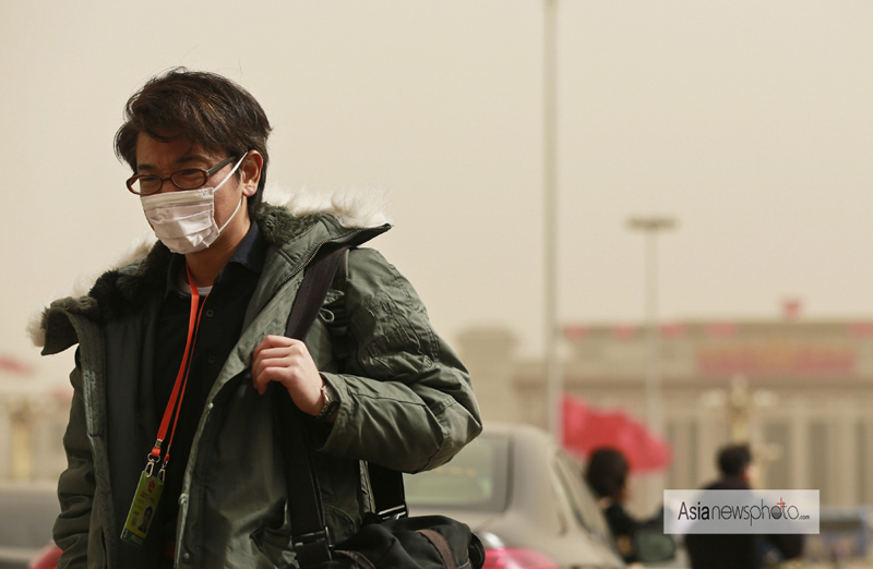 6、2013年3月9日,北京天安门广场,一位采访两会的记者戴着口罩顶着风沙前行。当日,北京刮起8级大风并伴有沙尘天气。 来源:中国日报亚洲新闻图片网(冯永斌 摄)