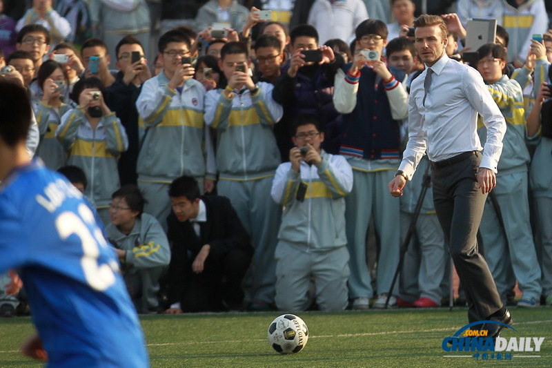 2013年3月20日,中国青少年足球发展及中超足球联赛推广大使大卫-贝克汉姆,访问北京二中并与学生互动。图为贝克汉姆指导学生踢足球 崔萌/china daily