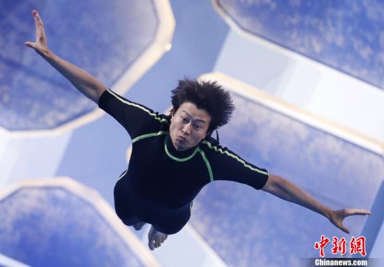 4月11日,国内首档明星跳水竞技秀《星跳水立方》继续在北京“水立方”录制,游鸿明奋力一跳。游鸿明此前表示,晚上躺在床上也一直在思索、琢磨动作,睡不着觉,“连做梦都在跳水”。中新社发刘关关 摄