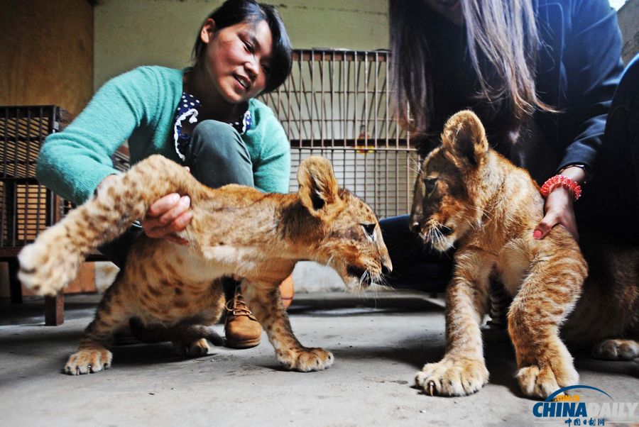 2013年5月29日,武汉九峰森林动物园,两只自然繁育的狮宝宝在百兽幼儿园初次露面,刚见到生人,虽有些胆怯,却也不失草原王者的风范,不时秀秀自己的小爪牙,发出低闷吼声,萌态百出。4个月大的小家伙已有有30多斤重,抱起来颇有分量。