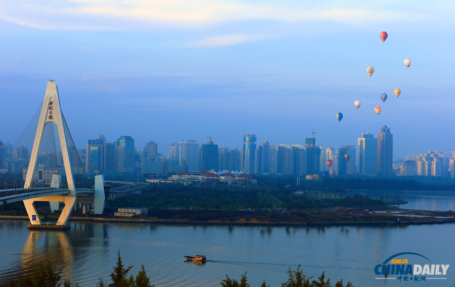 2013年6月18日,海南海口万绿园,15只参加第七届海口热气球节暨H1中国热气球挑战赛的热气球缓缓升空,经过近2.5小时飞行,于8点55时顺利到达对岸雷州半岛的海安,第五次刷新中国热气球飞越琼州海峡的纪录。