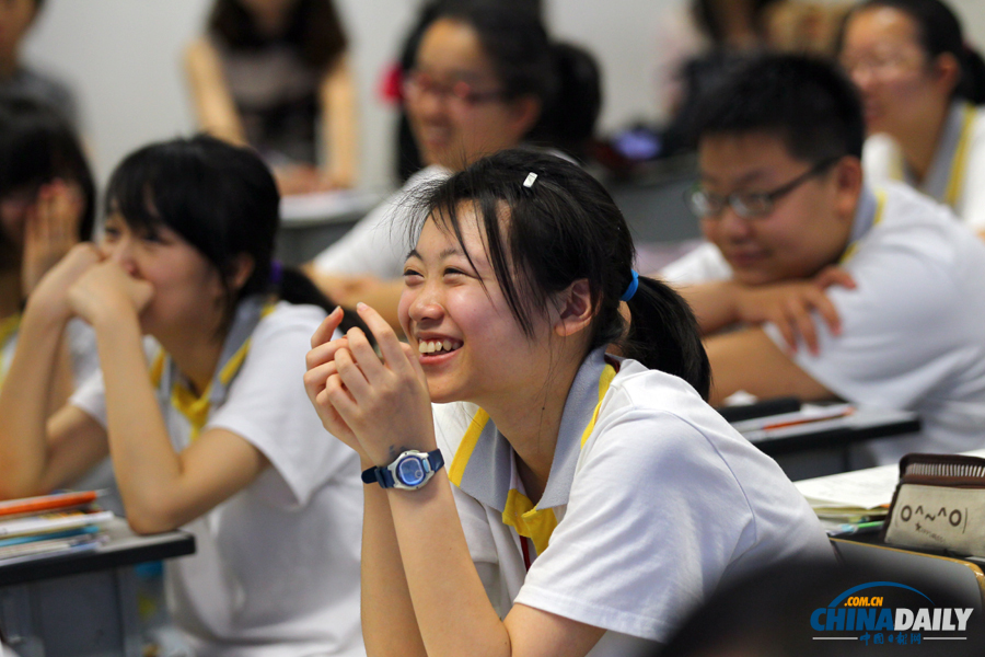 6月20日上午,北京二中,李晓然同学(中)饶有兴趣地收看来自神舟十号女航天员王亚平在天宫一号进行的我国首次太空授课。 邹红 摄