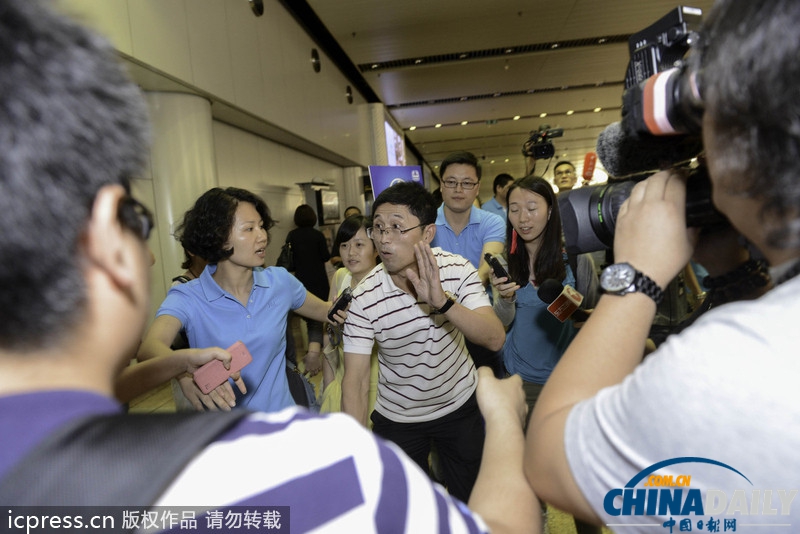 013年9月15日,北京,被扣韩国的“海娜号”邮轮滞留旅客先后乘坐包机韩国济州国际机场回京,受到媒体的关注。 图为海娜号首批返京乘客接受媒体记者的采访时,称很忙不愿多说。图片来源:京华时报-东方IC