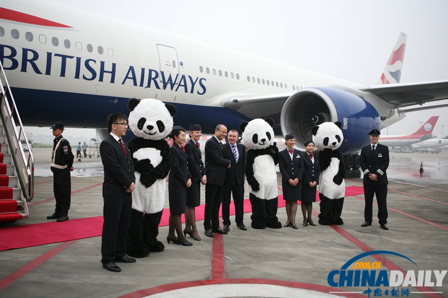 伦敦至成都直飞航班首航 “熊猫大使”列队欢迎