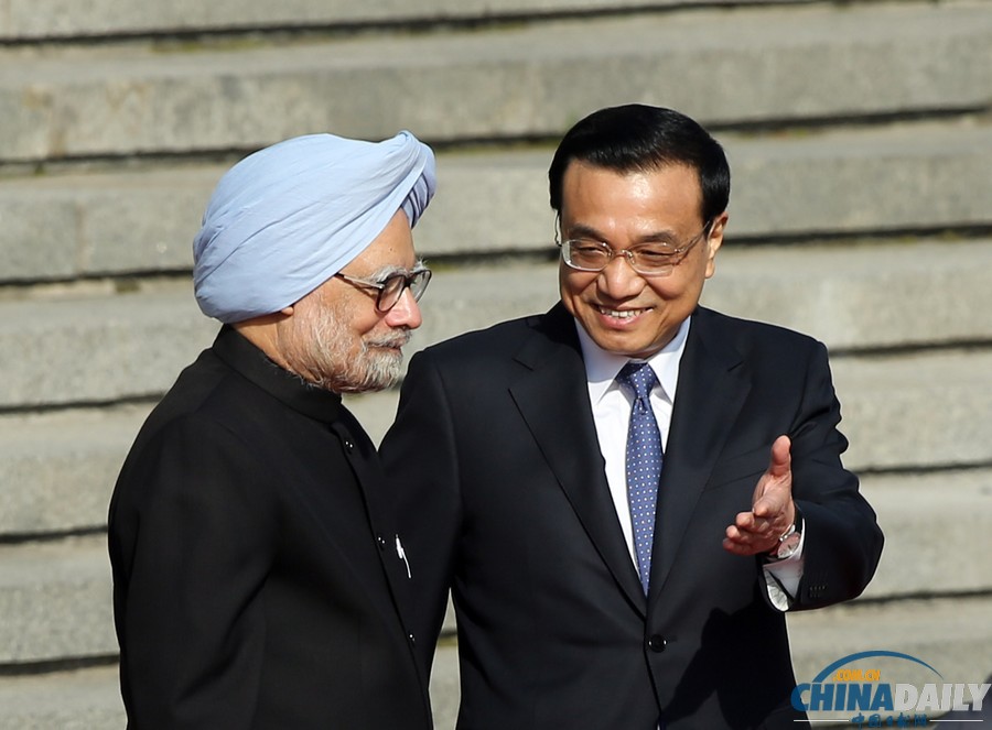 中国国务院总理李克强(右)欢迎印度总理辛格访华。(中国日报记者 武治义 摄)
