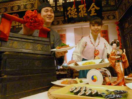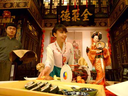 “鸭粒石锅拌饭配鸭味大酱汤”、“鸭片米果”、“龙凤寿司”----这一道道看似有着浓郁日韩风情的菜品,并不是出自什么日韩料理的餐厅,而是有着147年历史的前门全聚德起源店在第一季度推出的创新菜品。近日,在位于前门大街的前门店特色老铺餐厅中,近十道日韩风味全聚德特色创新菜也正式与消费者见面。