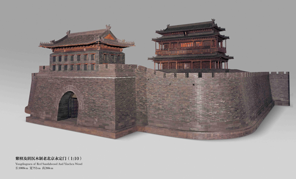 用紫檀木和阴沉木按1比10的比例复制的老北京城门楼“永定门”。
