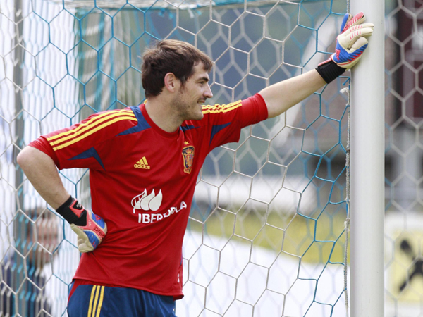 5月27日,西班牙队在奥地利的施伦斯训练,备战即将到来的欧洲杯。图为西班牙队门将卡西利亚斯在训练中。图片来源:路透