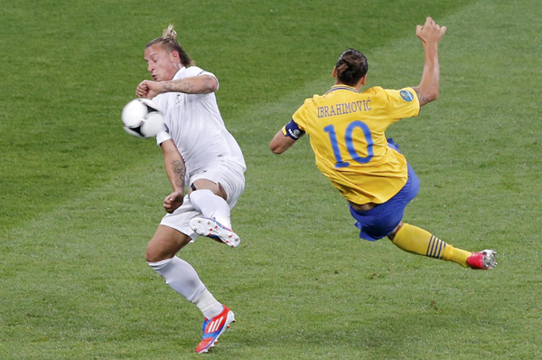瑞典队伊布拉希莫维奇凌空射门得分。图片来源:路透