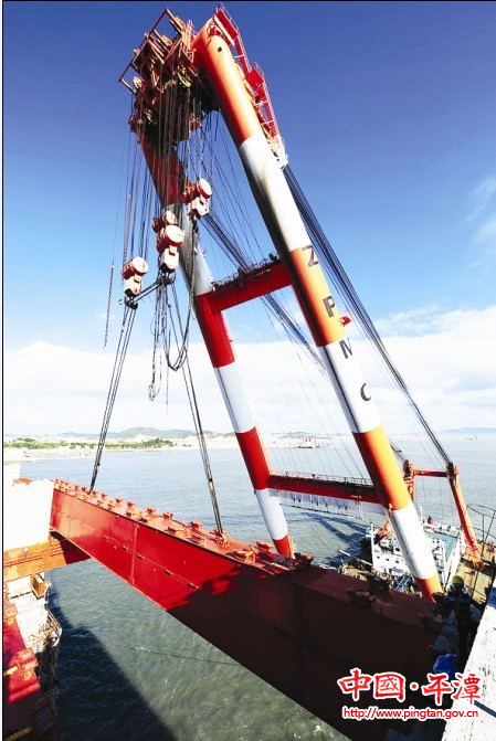 “拓宽部分总长250米,它是除了主桥合拢后,又一个关键性工程节点。进行娘宫互通拓宽段箱梁的浇筑,施工方采取了异形移动模架施工工艺,最关键的部分就是今天的异形移动模架的吊装。”平潭海峡大桥有限公司副总经理何益勇说。