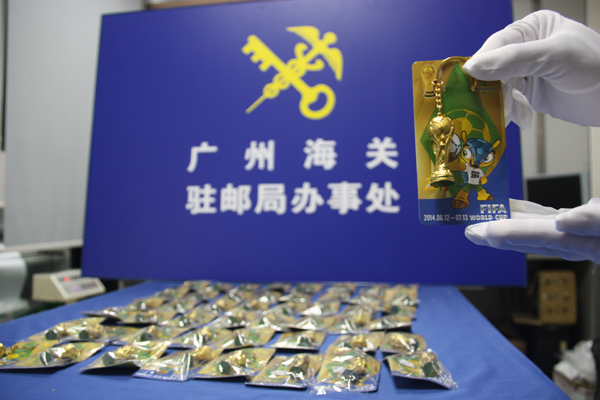 随着巴西世界杯足球赛临近,与世界杯相关的商品销售也越来越火爆,一些不法商人趁机生产、出口冒牌货。4月10日,广州海关驻邮局办事处在1件寄往马来西亚的邮包内查获涉嫌侵犯国际足联“FIFA”字样钥匙扣50个。这是开展“绿茵行动”以来广州海关查获的首起侵犯知识产权案件。