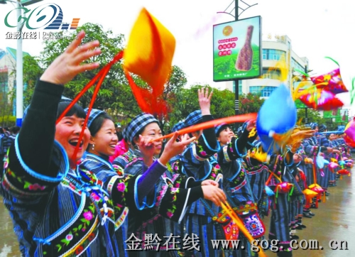 4月4日,望谟县举行三月三民俗活动,姑娘们在抛香包。据介绍,活动期间将举办布依族民族文化礼仪节目展演、非物质文化遗产展示展演、中国布依族文化论坛等活动。