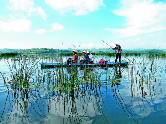 晴空万里,荡舟草海,好生惬意。(金艾 摄)