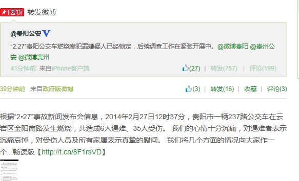 “2.27”贵阳公交车燃烧事故,是人为还是自燃?今天中午13点19分,贵阳市公安局官方微博正式发布:“‘2•27’贵阳公交车燃烧案犯罪嫌疑人已经锁定,后续调查工作再紧张开展中。”随后,贵阳市委宣传部官方微博“微博贵阳”也转发了这条微博。