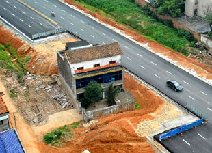 楼“站”路中央 六车道“瘦身”成三车道