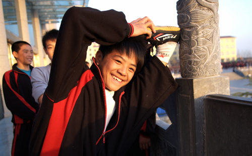 少林寺武僧团训练基地学员在练功(向明超 摄)