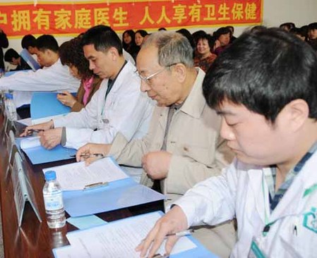 5月17日,社区家庭责任医生为签约服务的社区居民免费测量血压。当日,吉林省长春市的部分社区医生与千余户居民签订了“家庭责任医生签约服务”。家庭责任医生以所服务区域社区居民需求为导向,以辖区内的妇女、儿童、老年人、慢性病人、孕产妇等重点人群为服务对象,开展每年一次免费的常规体检,免费发放健康知识资料,免费建立健康档案,免费提供健康咨询,免费提供定期的健康营养指导,免费提供患者就医指导,帮助联系转诊医院、电话预约门诊、专家会诊等多项服务。新华社记者张颖 摄