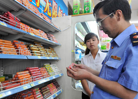 6月13日,吉林省工商行政管理局执法人员在检查一家超市内的熟肉制品。当日,吉林省工商行政管理局对长春市部分食品经营企业进行突击检查,此次检查主要针对经营企业的产品生产和经营许可证以及容易存在违法添加剂的各种食品。对于部分企业销售含违法添加剂食品的行为,工商部门将进行严处。新华社记者林宏 摄