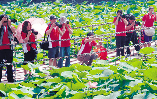 七月,正是荷花盛开时。7月10日,沈阳市百名摄影爱好者来到新民市三农博览园,抓拍千娇百媚的荷花美景。红衣映衬着喜悦的脸庞,绿荷间钻出朵朵新蕊。相机定格的一刹那,真美。记者王勇 摄影