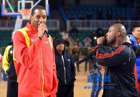 11月20日,麦迪(左)在向球迷解释。当日,在青岛双星队赛前热身赛第三场比赛中,由于部分滨州球迷不满双星队球员麦迪上场时间较短,向场内投掷杂物,致使比赛提前结束。赛后,麦迪返场向球迷解释,由于比赛场馆温度较低,为防止受伤,保证即将开始的CBA联赛,所以球队减少了他的出场时间。麦迪希望球迷理解职业球员和球队的选择,他将在CBA联赛中争取为球迷们奉献精彩的比赛。新华社记者朱峥摄
