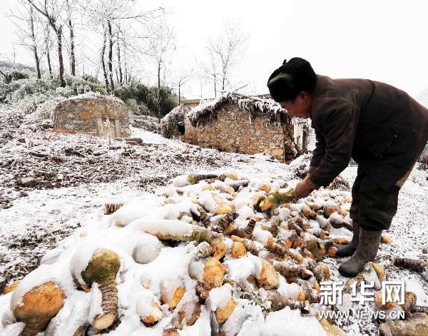 1月14日,昭通市大关县红旗村农民李金华在整理被冻坏的经济作物。近期,受强冷空气影响,云南昭通市大部分地区遭受冰雪灾害,受灾群众达43万人,10万人饮水困难,农业、电力、交通等部门受灾严重。新华社记者杨宗友摄
