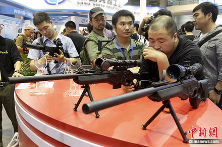 5月19日,第四届中国(北京)国际警用装备及反恐技术装备展览会在北京展览馆举行,军事迷体验国产狙击枪。中新社发杜洋摄