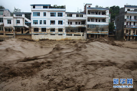 6月6日,洪水经过贵州省望谟县城郊一排居民楼。贵州出现入汛以来首场持续强降水天气过程,截至6月6日12时统计,近期暴雨洪涝灾害造成全省20万人受灾,因灾死亡1人、失踪15人,紧急转移安置6万余人,农作物受灾面积9383顷,因灾倒塌房屋134户411间,损坏房屋2782间,因灾造成直接经济损失1.7亿元。新华社发(黄世林摄)(资料图片)