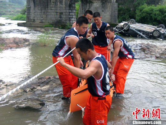 7月19日下午,福建省宁德市古田县一辆小车因转弯时车速过快,从该桥的引桥处直接飞出,在空中旋转数周后翻身倒扣到十几米深的桥底。图为10余名消防员横渡溪流救援进行救援。龙敏摄