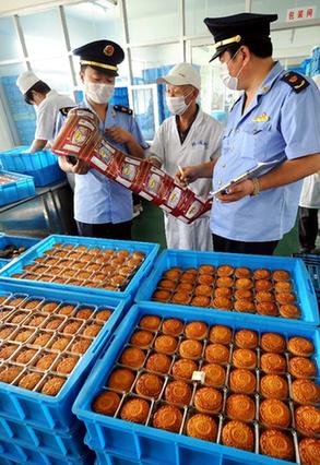 8月26日,南京江宁区秣陵工商所工商执法人员在桃源村食品厂月饼包装车间检查即将使用的包装纸标识。近日,南京市江宁区工商局组织工商执法人员对区内月饼生产和销售企业开展专项执法检查,强化对月饼质量以及包装、标识、生产日期、保质期、储存条件等的督查管理,以杜绝假冒伪劣,保障中秋月饼市场的消费安全。新华社记者孙参 摄