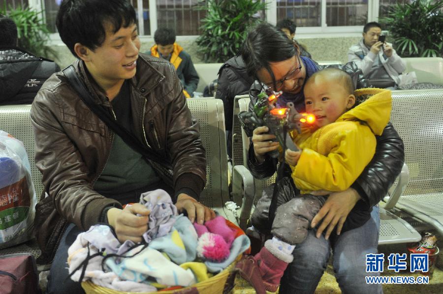 1月20日晚,在杭州火车站候车厅,来自贵州遵义的1岁半男孩何志博在母亲的怀里把玩特意带回家过年的玩具枪,他们将乘坐L199次列车返乡。当日,为应对春运客流的提前到来,浙江省铁路开行了杭州至贵阳的L199次列车、杭州至重庆北的L773次列车,大部分乘客均为在浙江工作的外来务工人员。临客列车主要是针对票源紧张的车次目的地加开的。据了解,杭州火车站将在2013年春运前后增开50趟临客列车。新华社记者黄宗治 摄