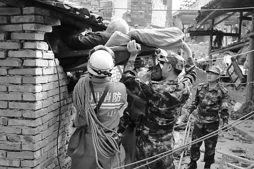 4月20日,在四川省雅安市芦山县清仁乡仁加村前坝组一倒塌的民房内,乐山消防救援队搜救小组在入户搜救中成功救出一名80多岁的瘫痪老人。乐晓轩摄(新华社发)